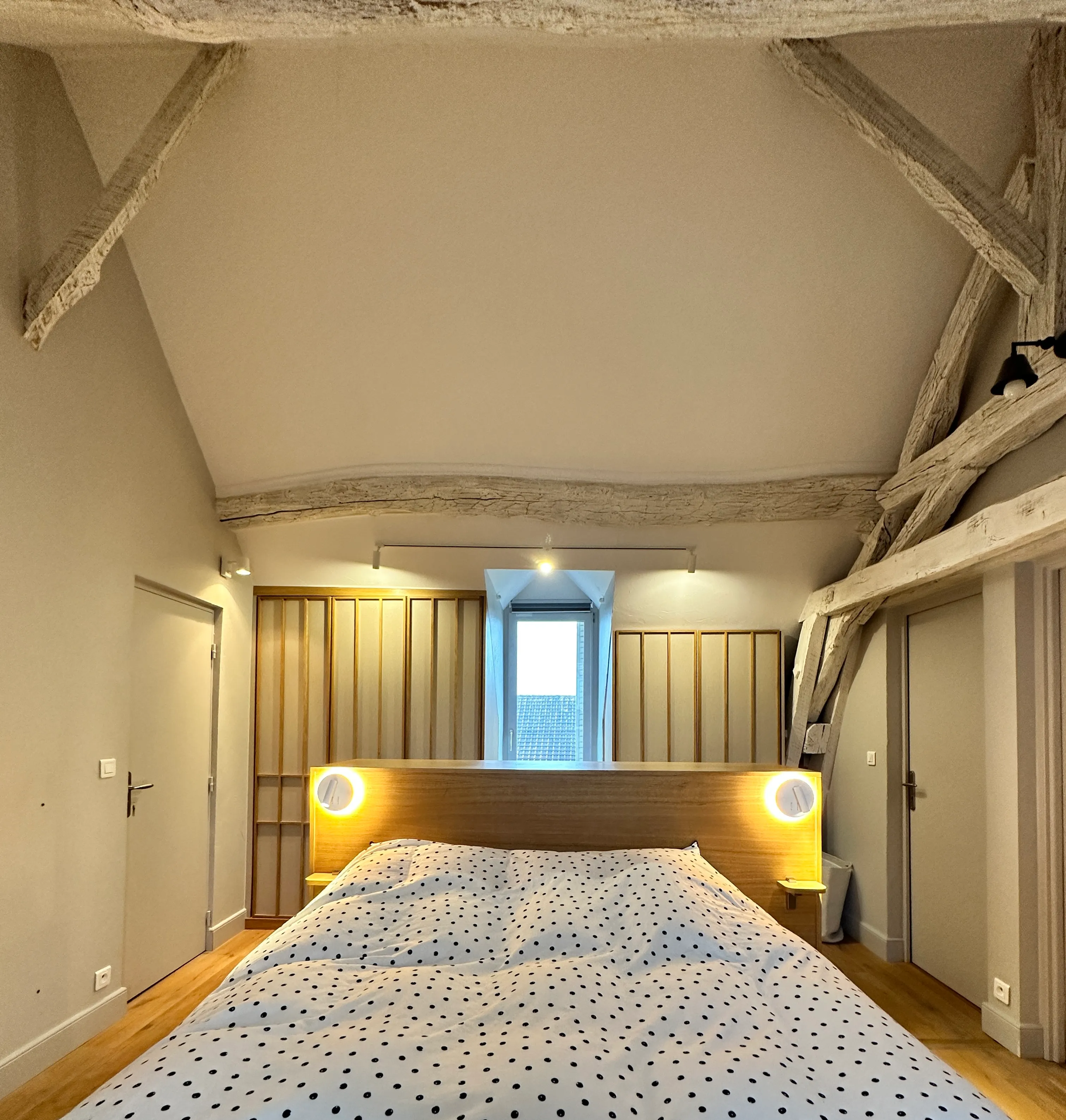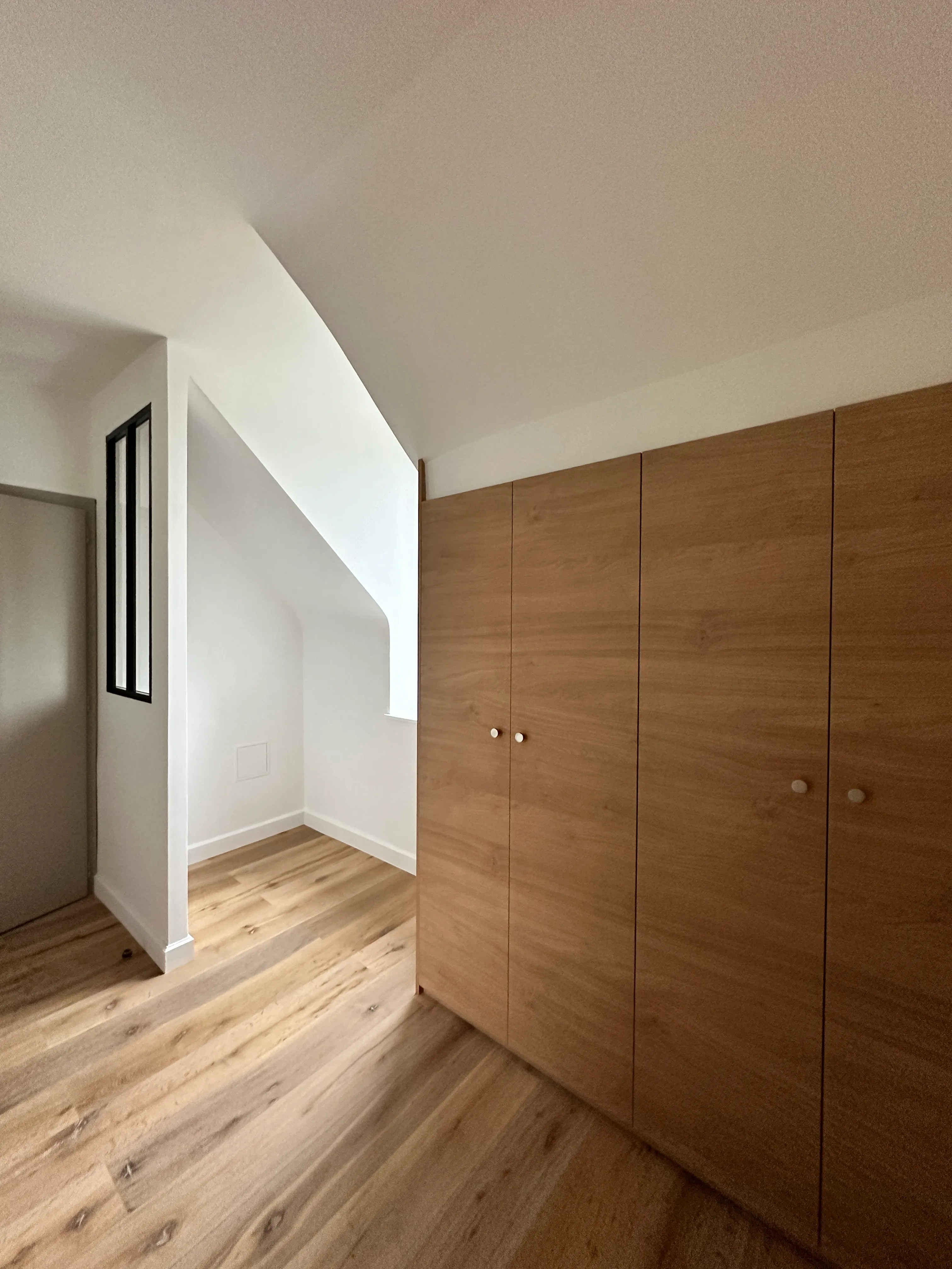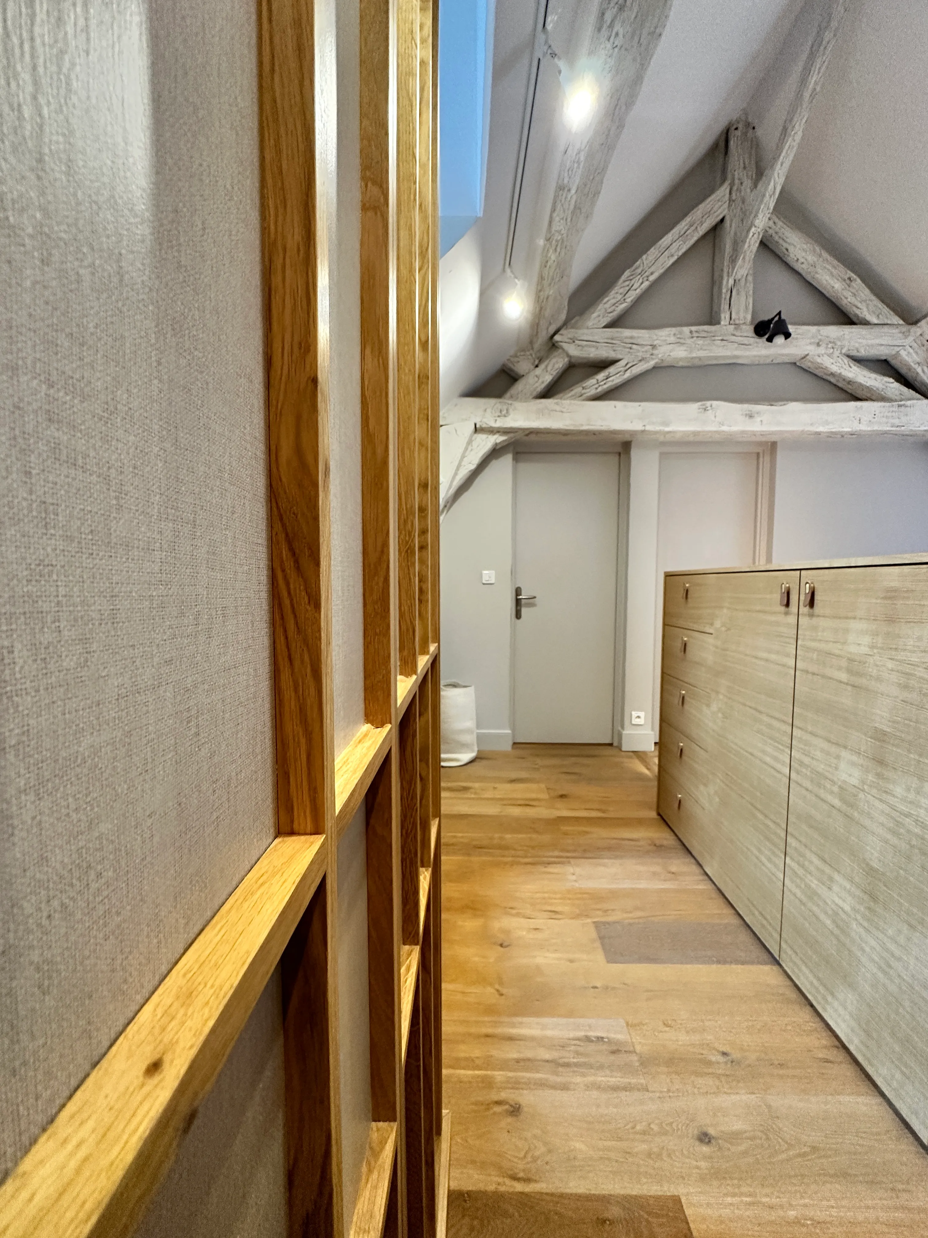- Restructuration de la suite parentale : Un travail de décoration d'intérieur est venu compléter l'aménagement de cette chambre parentale sous les toits pour garantir un espace de repos adapté. Concrètement, deux dressings sur mesure ont été intégrés, une tête de lit accueillant des rangements a été créé et l'esprit général de la pièce a évolué à travers le choix d'un nouveau mobilier ;